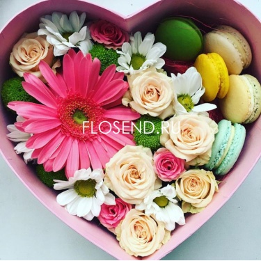 Цветы и макаронс маме в коробке сердце